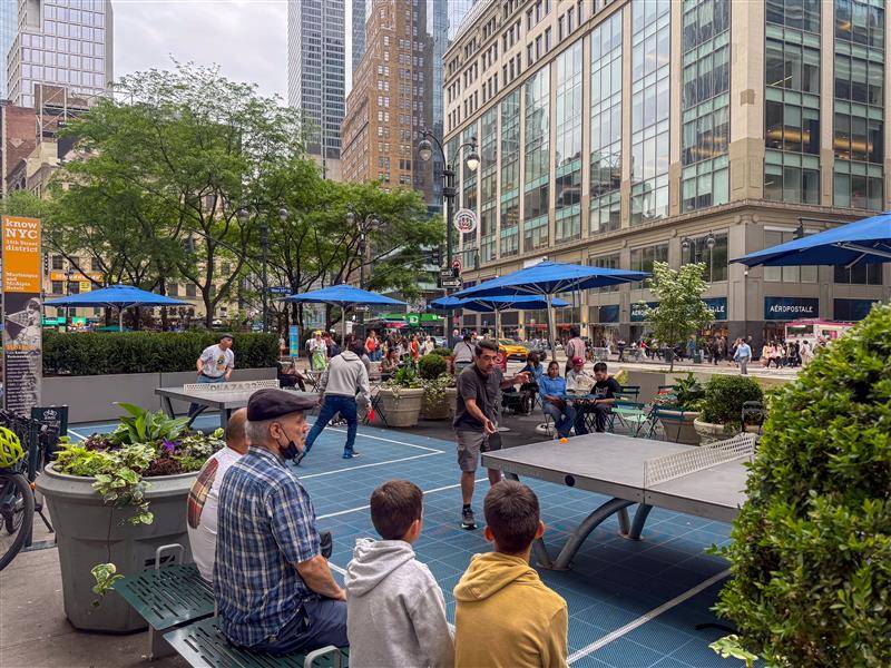Take a break from work or meet friends for Ping Pong in Greeley Square! Bring your own balls and paddles and play a friendly game at our two ping pong tables.