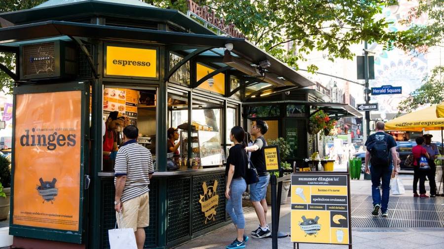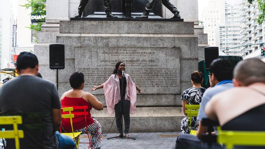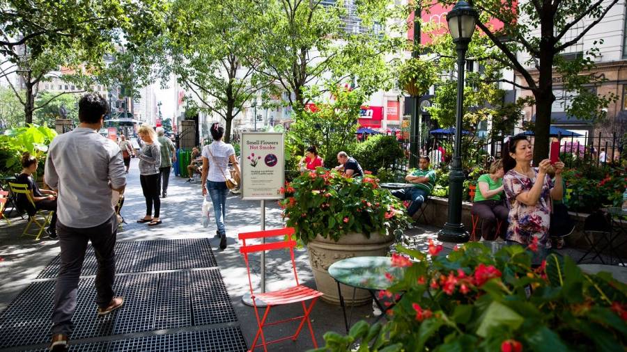 Herald Square Park has a seasonal reading room, public bathroom, beautiful seasonal plantings, and a Wafels & Dinges food kiosk.